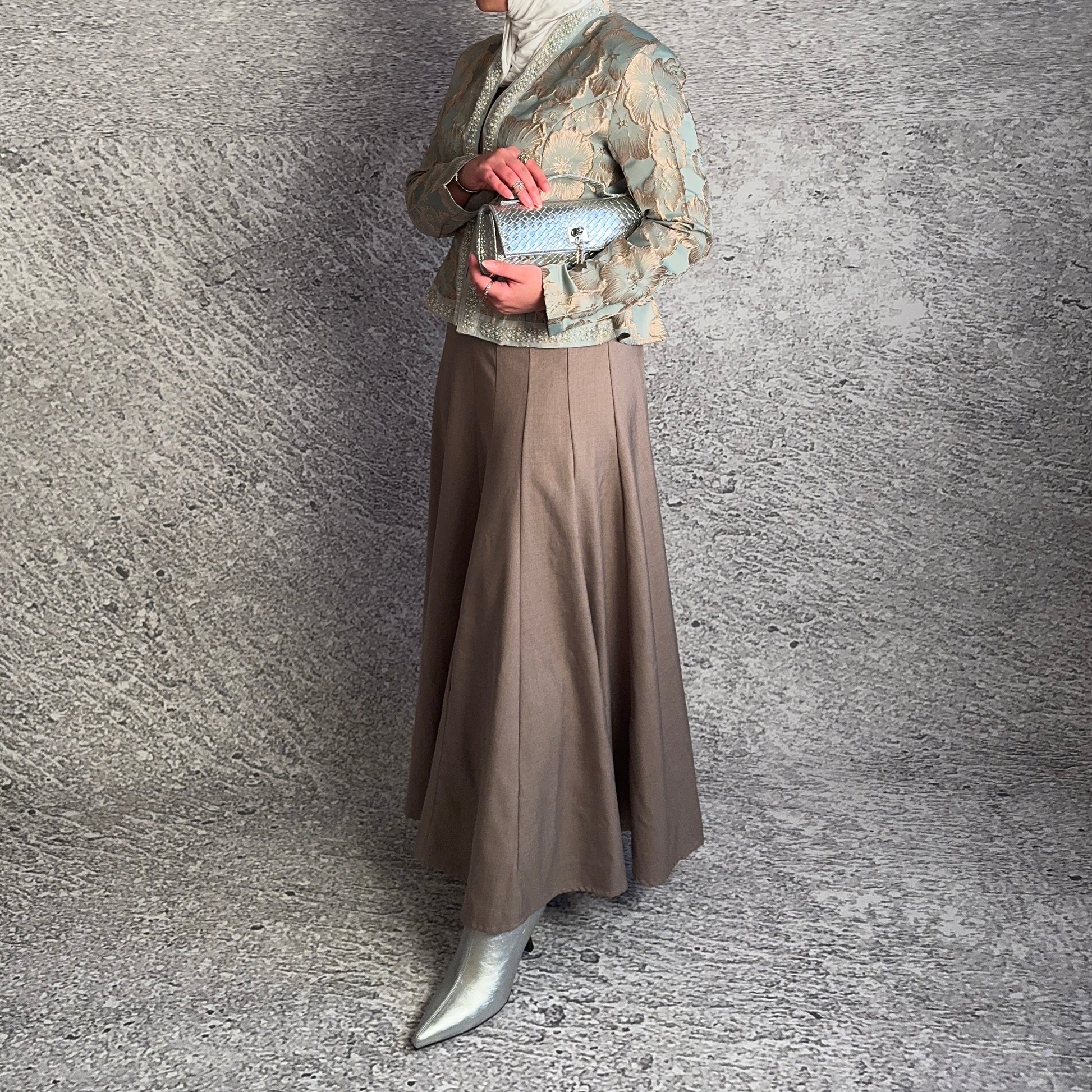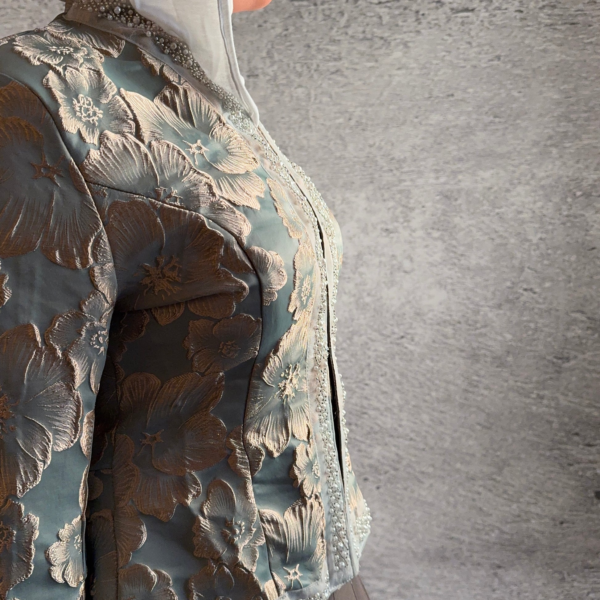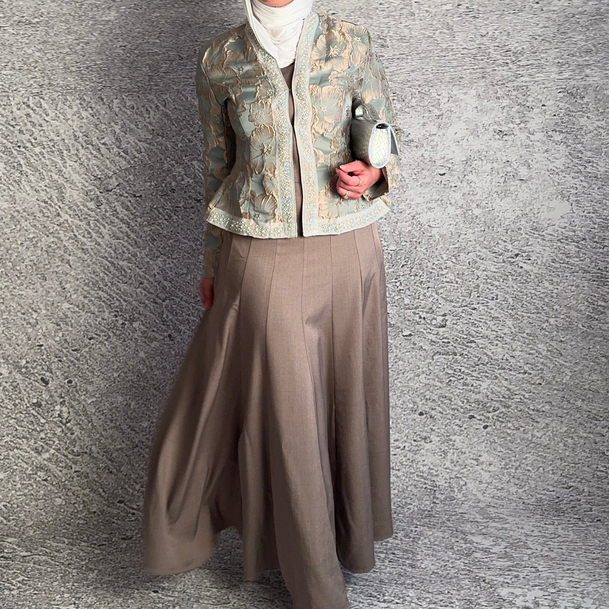 Mumbai: embroidered jacquard jacket with sleevless dress combined subtle Indian-inspired details, blending tradition with contemporary elegance—perfect for a refined Ramadan look.